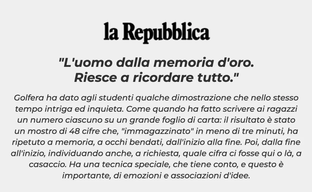 "Golfera insegna un metodo, attraverso il quale ognuno di noi può potenziare la memoria con risultati eccezionali."